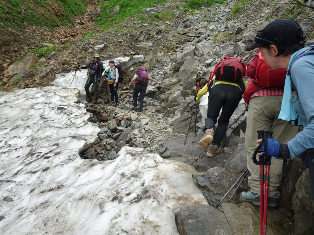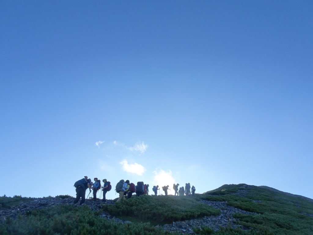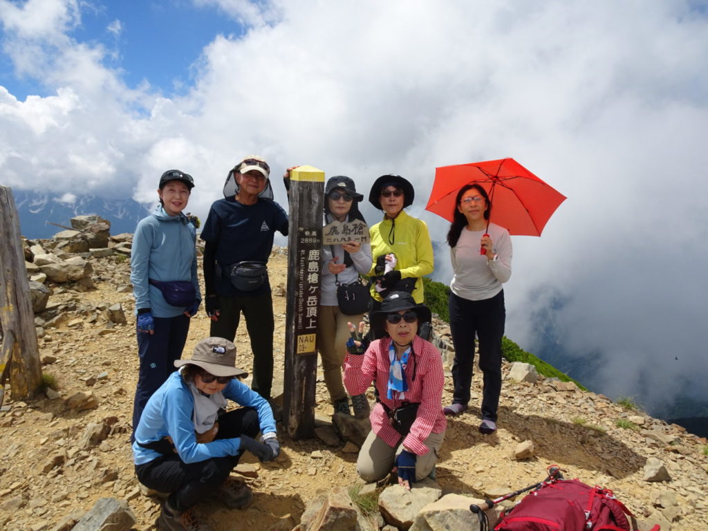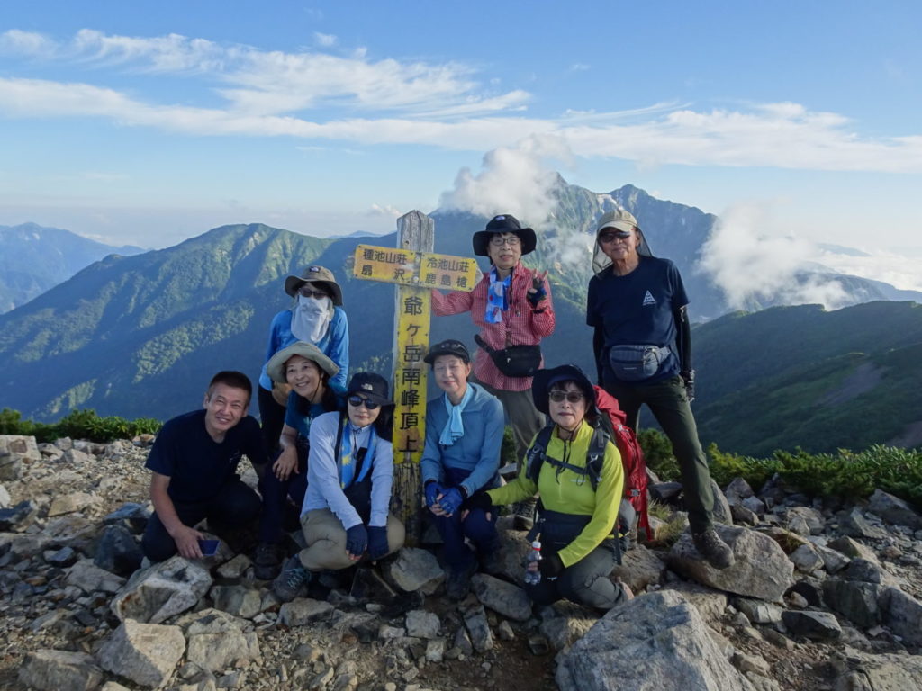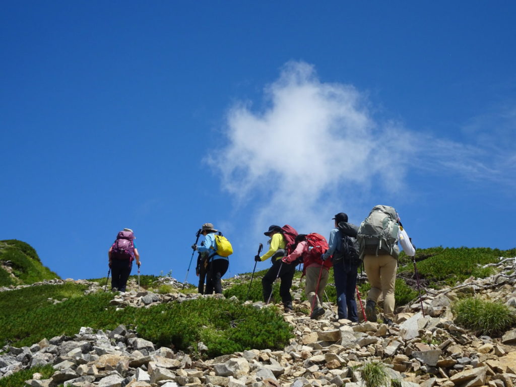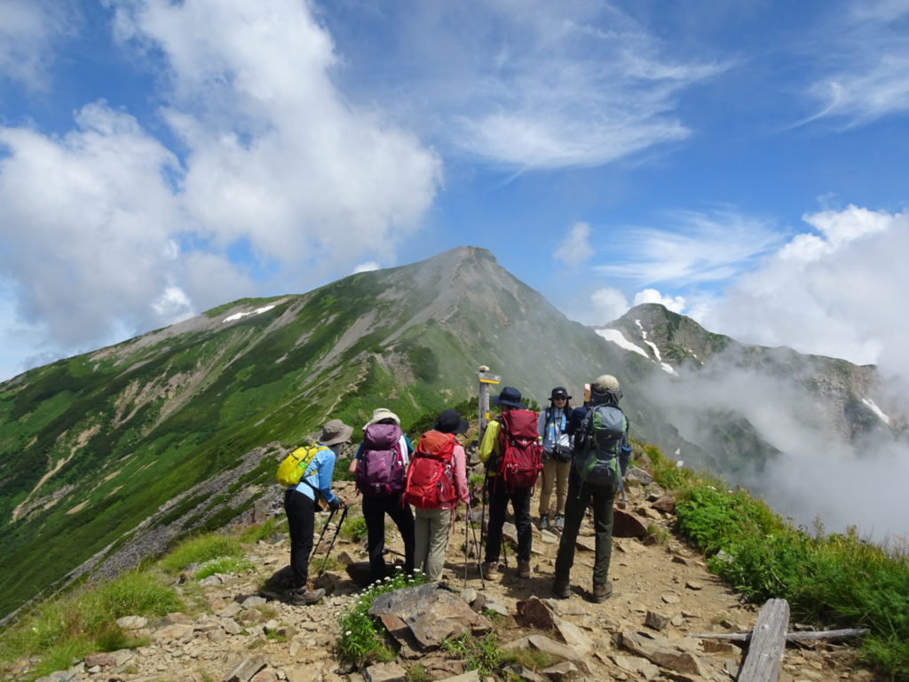 心配していた天候も予想以上の好天で、暑さに苦労した面もありましたが予定の登山が出来て参加の皆さんには感謝しております。カメラマンをしていただいた坂井さんには、健脚を活かしてパーティーの前から後ろから素晴らしい写真を撮影していただき感謝しております。立山連峰をはじめとして北アルプスのオールスターズの眺めを楽しむことが出来ました。また運よく2日続けてライチョウを見ることが出来ました。ただ初めての山で、うまく休憩場所を見つけることが出来ず、ご迷惑をかけました。(植田)