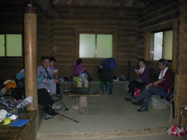 予定通り2時間で避難小屋到着しやっと昼食タイムとなりましたが、ここで本格的な本降